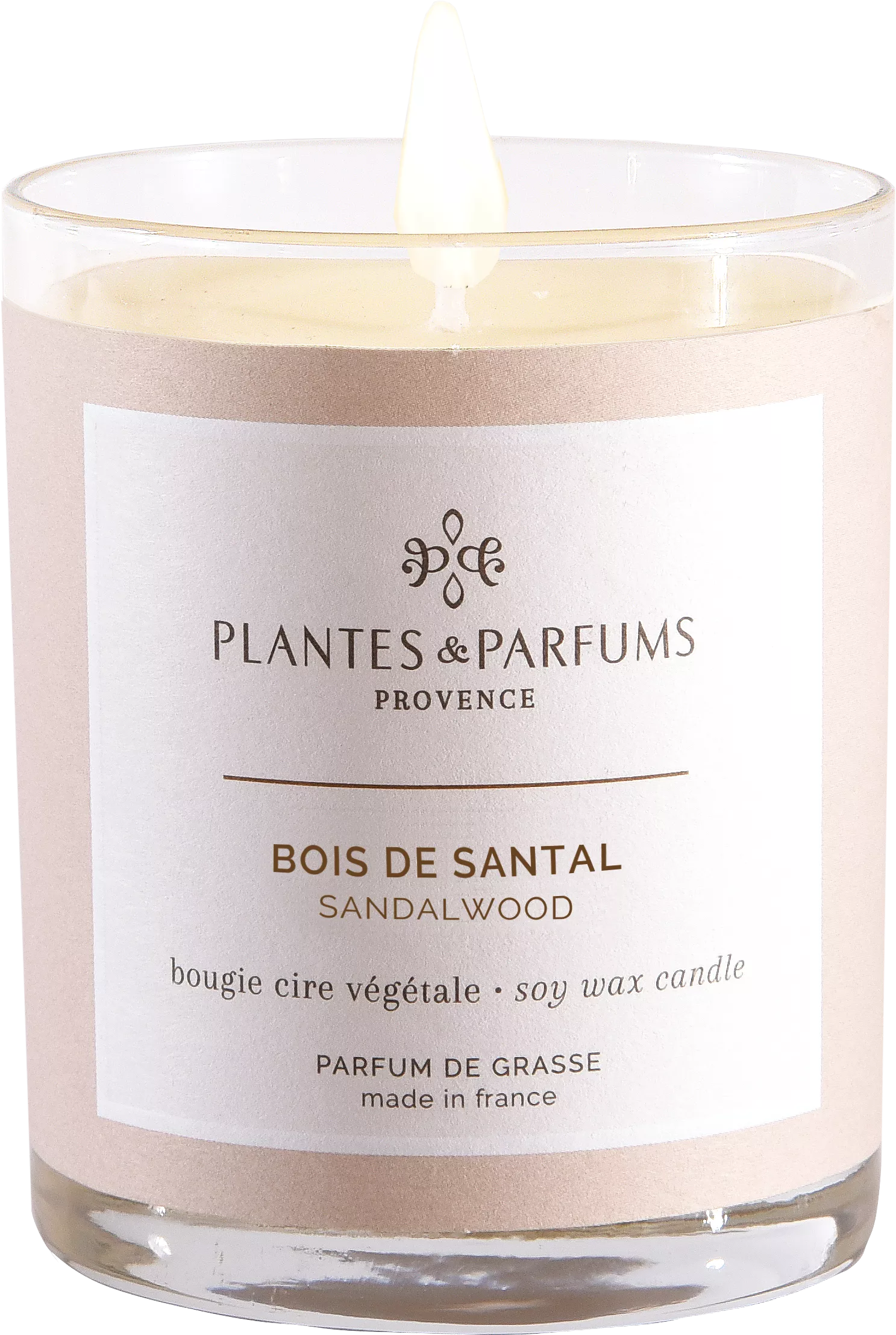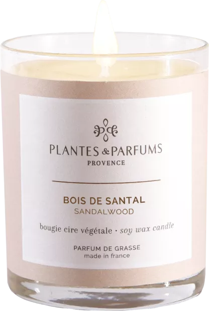 La Bougie Végétale Parfumée Bois de Santal délivre des notes boisées et orientales de Santal, des effluves capiteux, fins et nobles.