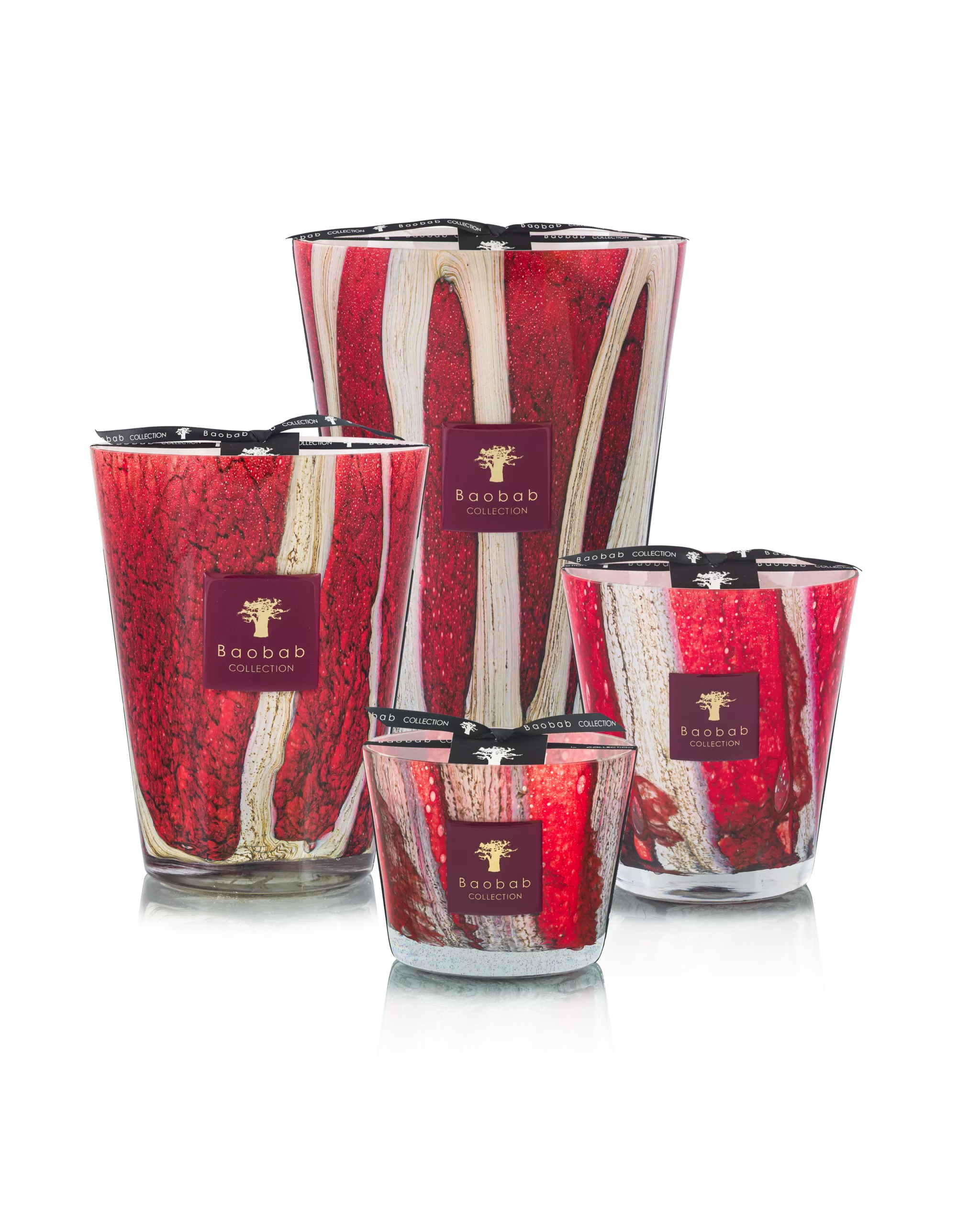 Son verre, d’un rouge profond évoquant les pierres précieuses, est obtenu en plongeant le verre en fusion dans des pigments naturels, puis en l’enveloppant d’un fil de verre vertical. Le décor se révèle au moment du soufflage, fruit d’un savoir-faire exigeant maîtrisé par les artisans.