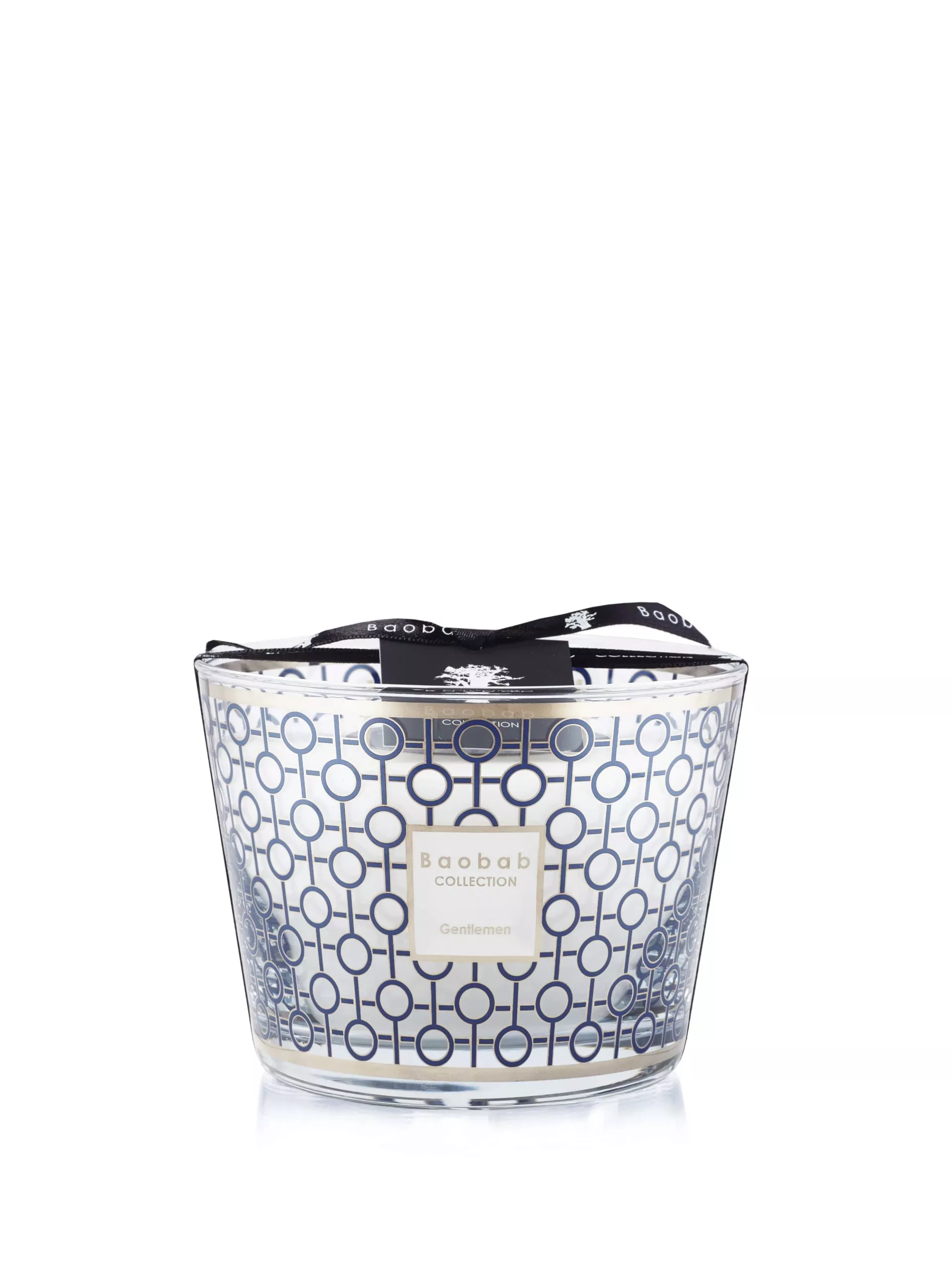 La bougie parfumée est réalisé dans un verre recouvert d’une sérigraphie platine et bleue marine.