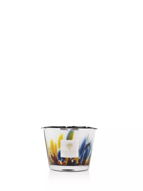 La bougie parfumée Mayumbe est réalisée dans un verre soufflé bouche par nos artisans verriers, parsemé de couleurs allant du bleu canard au jaune safran.
