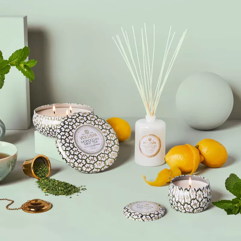 Soulagement bienvenu de la chaleur du désert, Moroccan Mint Tea mélange des agrumes frais et croquants et de la menthe verte avec un cœur floral intriguant de fleurs de tilleul, de néroli, de jasmin et d'ylang ylang. Invitant instantanément à la sérénité avec un soupçon d'euphorie agréable, l'infusion ajoutée de thé vert gunpowder, de cassis et de gingembre effervescent crée un voyage aéré pour les voyageurs en fauteuil et au-delà.